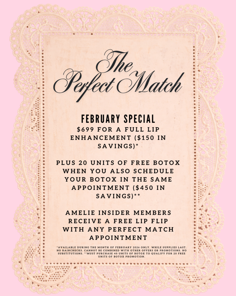 Fall in love with your lips this February. Our Perfect Match special includes a full lip enhancement for $699 (a $150 savings). Want even more glow? When you schedule Botox in the same appointment, you’ll receive 20 units of Botox free—that’s up to $450 in savings.